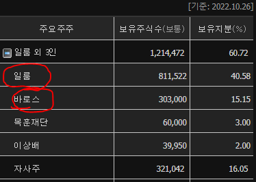 최대주주를 살펴보자. 일룸이 40.58%로 대주주인 것을 확인 할 수 있고 그 다음 15.15%를 가지고 있는 바로스다.