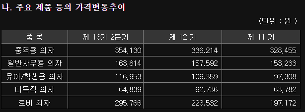 2) 원재료, 인건비 등의 상승이 불러일으킨 효과 : 의자 가격은 전부다 오르고 있다.