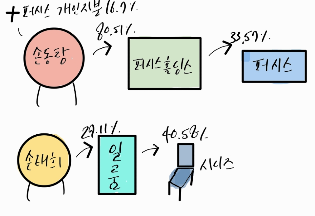 손동창 명예회장이 지분 80.51% 가지고 있는 퍼시스 홀딩스는 원래 가구를 만드는 '일룸', 의자를 만드는 '시디즈' 사업 모두를 영위하고 있었다. 그런데, 2016년 당시 시디즈(현 퍼시스홀딩스)는 일룸 지분 45.84%를 이익 소각 발표했다. 이익소각이란 기업이 누적이익금이 발생하면 주식 일부를 매수해 소각하는 것을 뜻한다. 즉, 지분을 줄이는 전략을 펼친 것인데, 퍼시스홀딩스의 일룸에 대한 적어진 지분율을 손태희 사장에게 흘러들어간 것으로 보인다. 손태희 사장의 일룸지분은15.77% -> 29.11% 상승하게 된다.