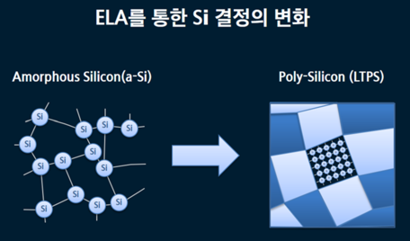 ELA장비는 LTPS(Low Temperature Poly-Sillicon)결정화용 장비라고 일컫는데요. 즉, a-Si TFT를 LTPS TFT로 바꿔주는 것 뿐이라는 것만 이해하면 됩니다. 무질서한 실리콘배열을 질서정연하게 만들어주는 것이죠.