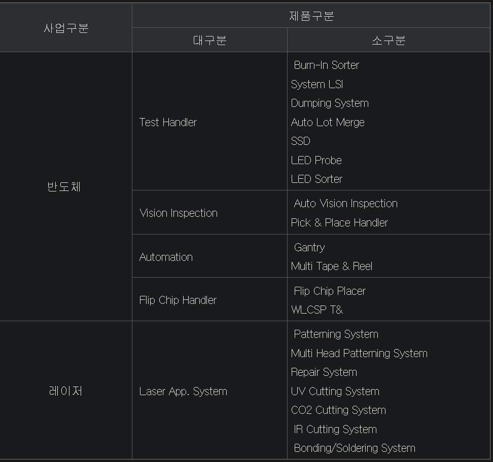 그 다음은 비전검사장치로 앞서 설명했듯, 반도체를 2차원, 3차원으로 검사하는 장비를 직접 제조하기도 한다고 말했었죠. 핸들러뿐만 아니라 검사장치도 직접 하면서 테스터+핸들러를 둘 다 가져가는 모습이 보입니다. 나머지는 소자핸들러, 비전검사장치 반복이라 생략할게요.