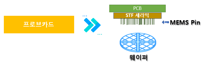 그리고, 프로브카드가 어떻게 구성되어있는지 알면 더 이해하기 쉬운데요. 프로브카드는 PCB기판-STF세라믹-MEMS Pin으로 이루어져있어요. 아래 그림을 봐볼까요. PCB와 MEMS Pin 사이에 STF 세라믹이 있죠.다만, 문제는 PCB와 MEMS Pin간의 가로 넓이 차이가 크다는 것이에요. 전기가 통해야하는 PCB는 넓으면 유리하고 검사를 세밀하게 해야하는 Pin입장에서는 좁고 촘촘해야겠죠. 이 둘 사이를 연결해주는 것이 바로 STF 세라믹의 역할인 것입니다.말 그대로 Space TransFormer인 것이죠. 또한, Pin의 하중을 지지해줌으로써 웨이퍼검사를 잘 할 수 있게 돕는 역할도 해준답니다.