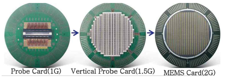 위 그림에서 보이는 MEMS는 직접 웨이퍼에 닿아서 검사를 하는 돌기부분이에요. MEMS는 Micro Electro Mechanical System의 약자인데요. 말 그대로 미세화한 전기적 기기시스템인 것입니다. 점점 반도체가 미세화와 지능화가 되면서 프로브카드도 미세화가 필요해졌어요. 아래 그림을 보면 프로브카드도 점점 1세대 > 1.5세대 > 2세대로 진화한 것을 알 수 있습니다.