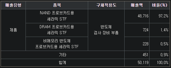 ·(핵심사업!!) 프로브카드용 STF세라믹 : 웨이퍼테스터의 MEMS(웨이퍼 직접접촉 검사)를 지지하는 역할 / 내수 73.3%, 수출 26.7%