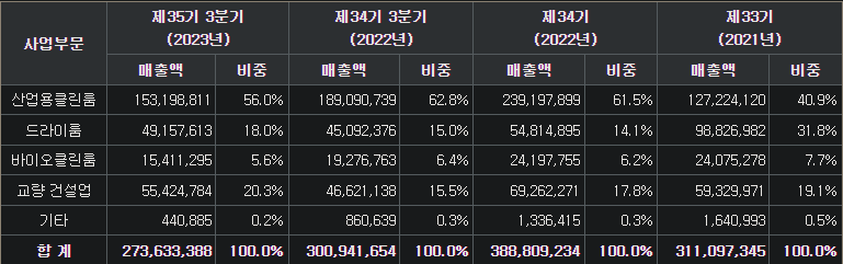 클린룸(56%), 드라이룸(18%, SK온), 바이오클린룸(6%, 삼성바이오로직스), 교량거더(20%, 다리 상부를 하부에서 지지)