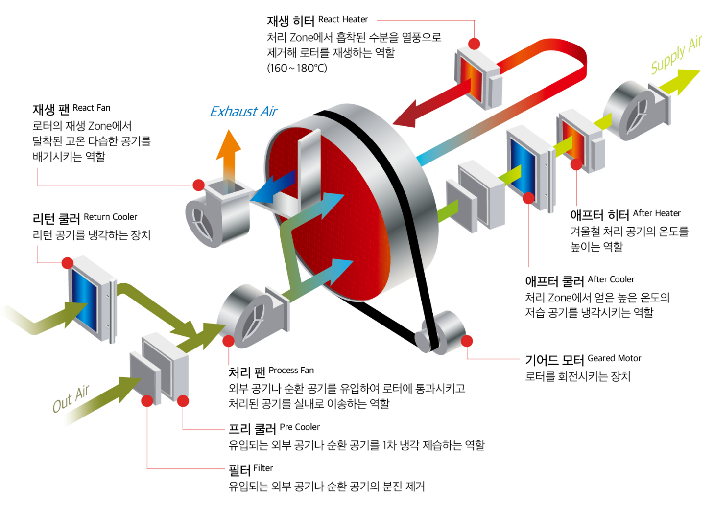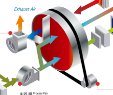 왼쪽부터 보면 외부공기(Out Air)가 들어오는 것을 볼 수 있어요. 바로 2차전지공장에 들어오면 큰일 나겠죠. 방어벽을 세웁니다. 첫 방어벽이 필터입니다. 그리고, 냉각을 시키면 기체에서 액체로 되기 때문에 다루기가 더 쉬워져요. 그래서, 프리쿨러라는 녀석이 1차 냉각을 시킵니다. 그러면 가공을 하겠죠(Process Fan). 여기서 중요한데요. 이 가공된 공기가 로터(회전을 의미, 가운데 빨간색)에 보내지는데요. 이 로터가 기어드 모터(Geared Moter)라는 회전을 돕는 장치에 의해 돌아가가게됩니다.