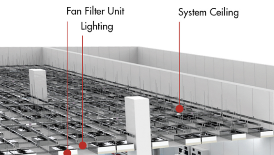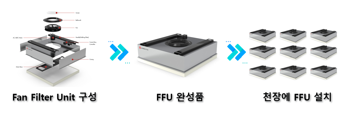 Fan Filter Unit이 보이죠. 줄여서 FFU라고 부르는데요. 이 FFU들이 천장에 설치되어 청정공기가 공급될 수 있게 필터링을 해주는 것이에요.