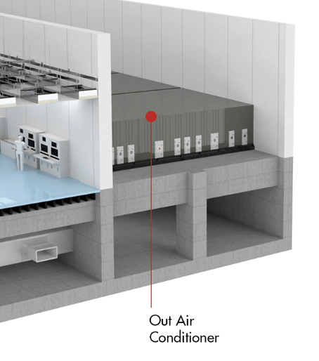 Out Air Conditioner도 마찬가지로 모듈공법으로 제작하여 현장에서 내외장 마무리만 하는 것으로 케이엔솔는 시공하고 있어요. 아래 그림을 보면, 처음 설명한 FFU(Fan Filter Unit)까지 공기가 흘러들어가는 것을 볼 수 있습니다. 맞아요. 클린룸 인프라는 서로 다 연계가 되어있는 것입니다.