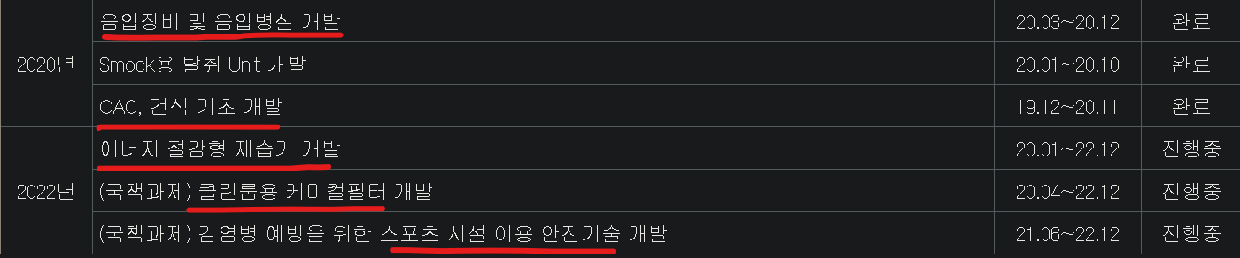 2022년으로 가볼까요. 드라이룸의 핵심은 제습이라고 말했었죠. 에너지를 최대한 절감하면서 제습하는 방법을 연구하고 있는 것으로 나와있습니다. 또한, 국책과제도 눈에 띠는데요. 아무래도, 반도체, 디스플레이 같은 공정에는 특수가스들이 떠돌아다니다 보니 이를 제어할 수 있는 케미컬필터 개발도 하고 있습니다. 그리고, 코로나 이후 바이러스에 대한 사람들의 관심이 부쩍 증가하며 일반 스포츠이용시설에도 동사가 개입할 수 있는지를 연구진행상황을 보며 지켜보면 될 것 같습니다.