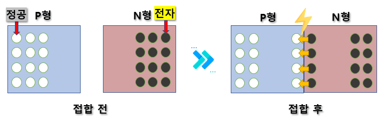 · N형 P형을 접합시키면 N형의 전자가 정공으로 이동하며 전류가 흐름