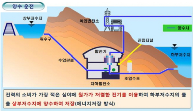 양수발전은 상하저수지의 고도차이를 이용한 전기를 만드는 것이에요. 심야시간에 보통 집, 공장, 기업들은 불을 끄죠. 전력소비가 덜합니다. 이때, 전력을 충분히 쓸 수 있을뿐만 아니라 저렴하게 사용이 가능해요. 이 전력을 이용해 하부저수지에 있는 물을 상부저수지에 옮깁니다. 그러고, 전력사용이 많은 낮시간대에 상부저수지의 물을 아래로 흘려보내 낙수차를 이용하여 터빈을 돌리는 것이죠. 즉, 수력발전원리와 똑같습니다. 다만, 한국에는 노르웨이처럼 물이 상부에서 하부로 항상 떨어지지 않기 때문에 미리 물을 상부에 옮겨놓는 것이죠. 양수발전은 한자로 이해하면 더 직관적인데요. 양수는 '날릴 양(揚)', '물 수(水)'를 써서 말 그대로 물을 옮겨 발전하는 것을 뜻합니다.