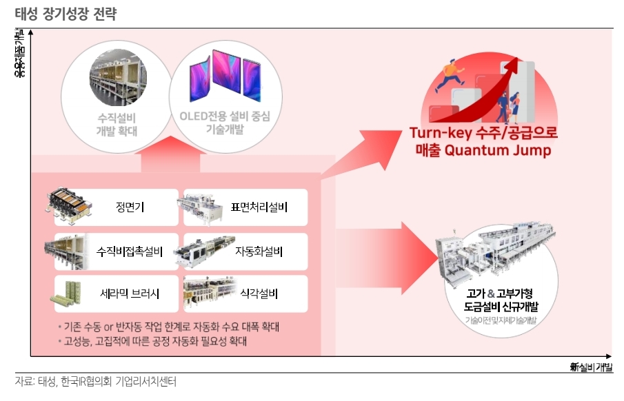 태성은 PCB 공정 자동화설비 전문업체입니다. 특히, 습식(Wet)설비에 대한 Turn-Key방식을 보유하고 있으며 습식설비 중 식각, 표면처리 관련 자동화설비가 주력제품입니다. 주요 고객사로는 PCB 제조업체인 삼성전기, LG이노텍, 대덕전자, 펑딩(폭스콘 자회사, PCB 1위업체) 등이 있습니다. 매출액 중 60% 이상이 FPCB향 설비에 집중되어있는 것이 특징입니다. 또한, 2차전지, OLED, 폴더블용 RF-PCB로 사업을 다각화하고 있습니다. 특히, 2차전지 동도금 장비를 2차전지 제조사의 제작요청을 받은 상태이며 경쟁력있는 제품을 내놓는다면 앞으로 큰 외형적 성장이 있을 것으로 예상됩니다.