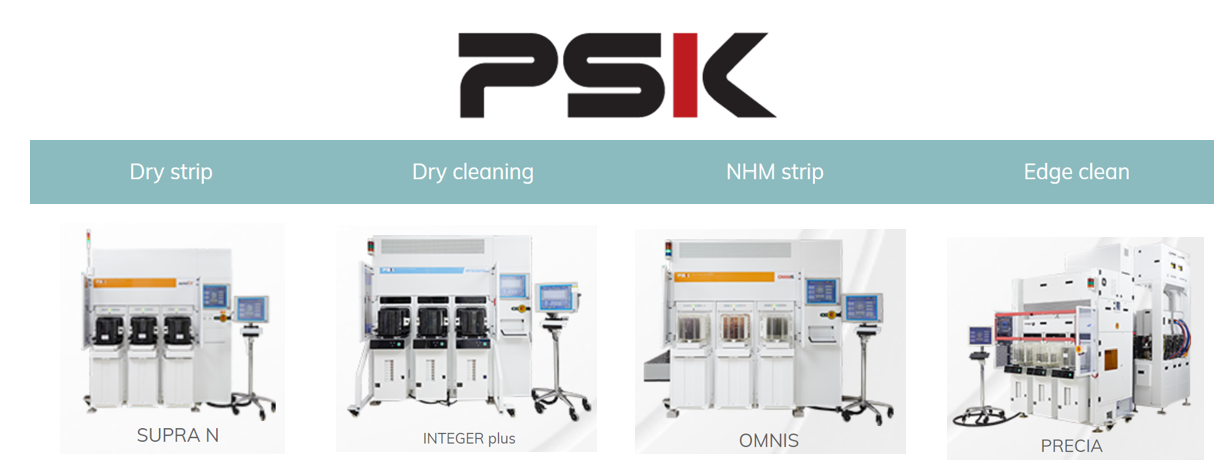피에스케이는 전공정 장비 및 부품을 제조 및 판매하는 업체에요. 포토공정이 끝나고 남은 PR제거(Dry Strip장비)와 하드마스크 잔여물 제거(Hard Mask Strip장비), 증착공정 전 산화물 세정(Dry Cleaning 장비)를 공급하고 있습니다. 국내에는 삼성전자가 주요고객사이고 점차 비메모리향 해외고객사가 늘어나고있는 추세입니다.