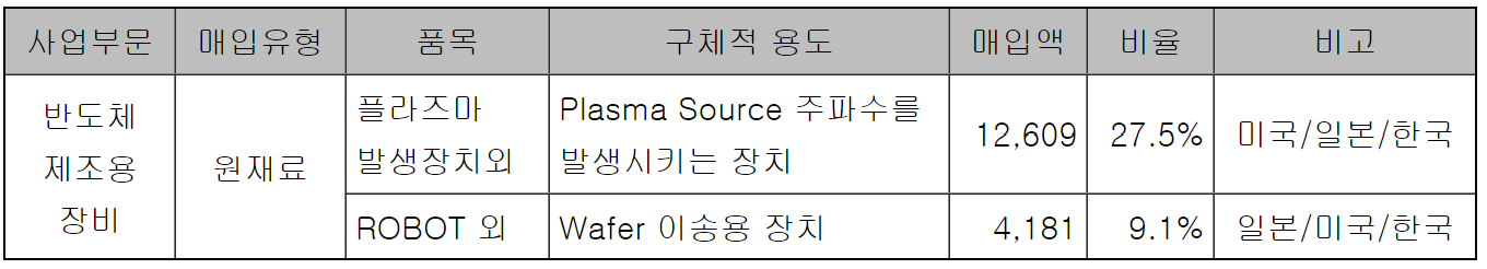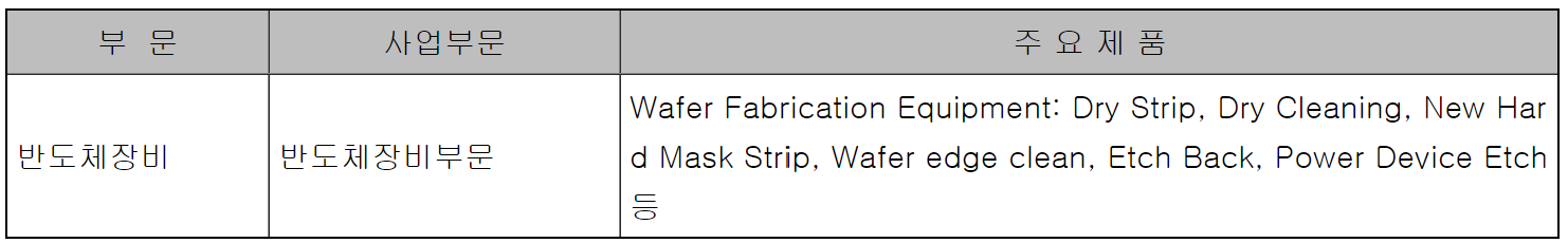 · 반도체 전공정 장비 : Dry Strip(잔여 PR 제거), Dry Cleaning(증착공정 전 잔여산화막 제거), Hard Mask Strip, Wafer Edge Clean / 내수 35%, 수출 65%