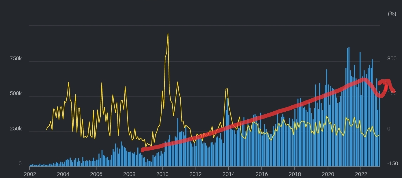한국 반도체장비 수출액 추이 : 긴 호흡으로 보면 계속 우상향 중이다. 다만, 22년 반도체침체로 하락했다가 다시 소폭 반등 중이다.