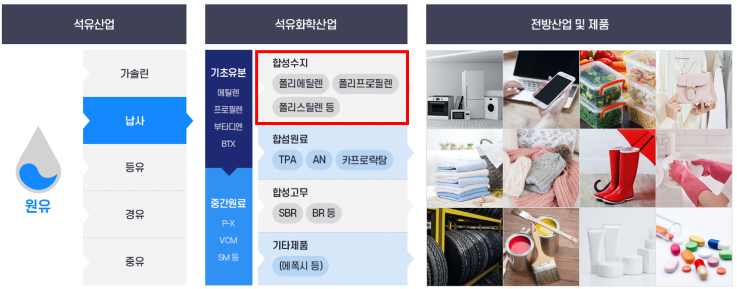 나프타(납사)를 800도 이상에서 끓이면, 기초원료인 에틸렌, 프로필렌, 부타디엔, BTX를 얻을 수 있는데요. 이러한 기초원료를 가지고 합성수지, 합성섬유, 합성고무를 만들 수 있는데, 오늘은 '합성수지'를 알아볼 예정입니다.