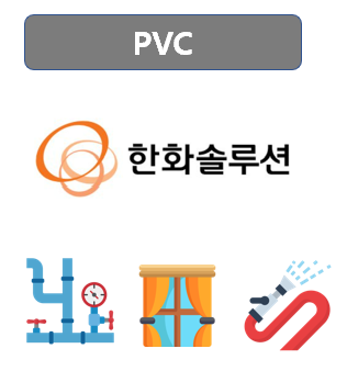 다음은 PVC인데요. 폴리염화비닐이라고도 하죠. PVC는 건설경기 같이 전반적인 산업에 두루두루 쓰입니다. 예를 들면, 상하수도 파이프, 건물의 창틀, 호스 등 사용처를 보다시피 일회용 플라스틱 보다는 토목이나 건설에 주로 쓰이죠. 그러다 보니, 건설경기가 달아오르면, PVC 수요도 덩달아 증가해요. PVC는 압도적으로 한화솔루션이 비중이 높아요(한화 솔루션 쉽게보기).