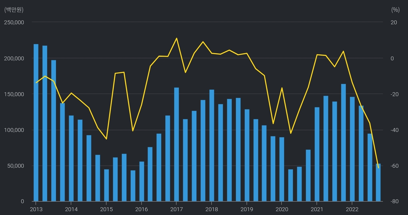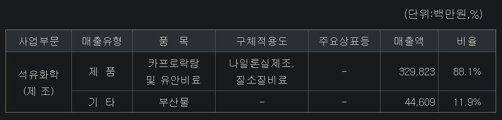 영업이익률 흑자인 적이 2017년, 2018년대 정도 빼고 모두 적자이다 : 효성티앤씨의 자회사로 모회사에 카프로락탐을 공급하기에 비싸게 팔지는 못하고 있는 것으로 추정