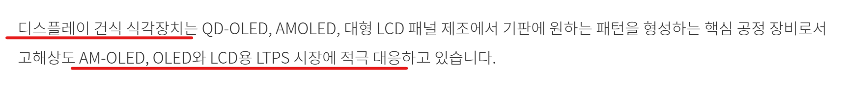 트랜지스터는 전기적 스위치와 픽셀 밝기조절을 하는 컨트롤러이기 때문에 명령을 전달하는 패터닝이 반드시 필요하죠. 패터닝이 들어간다는 것은 곧 식각과정이 필요하다는 것이고요. 그래서, 원익 IPS는 LCD, OLED, AM-OLED용 LTPS 시장에 적극적으로 대응하고 있다고 얘기하고 있습니다.