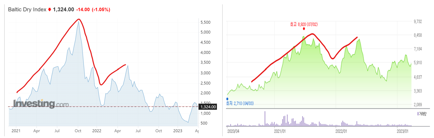 벌크선 운임인덱스가 따로 있는데요. BDI 지수라고도 합니다. BDI는 Baltic Dry Index의 약자인데요. 말 그대로 북유롭의 발트해에서 발표하는 벌크선운임지수입니다. 노르웨이, 네덜란드, 영국 등 해상강국들이 주변에 밀집해 있는 것을 생각해보면 왜 BDI지수가 여기서 태어났는지 알 수 있죠. BDI지수는 검색창에 치면 바로 나오는데요. HMM은 벌크선 비중이 6%(22년 기준)가 안되기 때문에 같이 주가가 움직이지는 않아요. 하지만, 벌크선 비중이 70%(22년 기준)가 넘는 팬오션은 거의 'BDI지수 : 주가'공식이 성립됩니다.