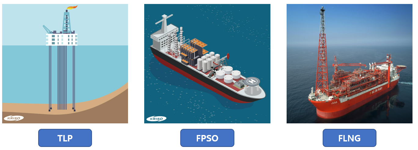 부유식 설비인 FPU는 하부구조의 모양과 어떻게 메어두는지에 따라서 종류가 나뉘는데요. TLP, FPSO, FLNG 등이 있습니다.