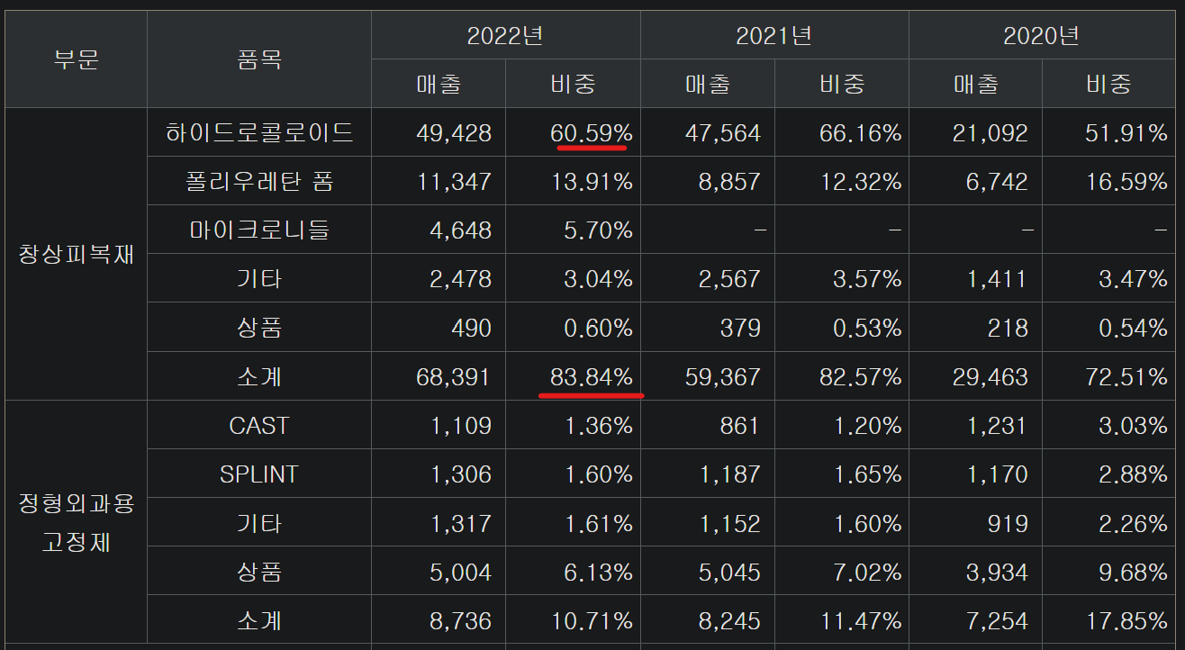· 창상피복재(83.8%, Wound Dressing) : OEM/ODM, 트러블케어 패치(하이드로콜로이드 기반 미용목적), 폴리우레탄폼