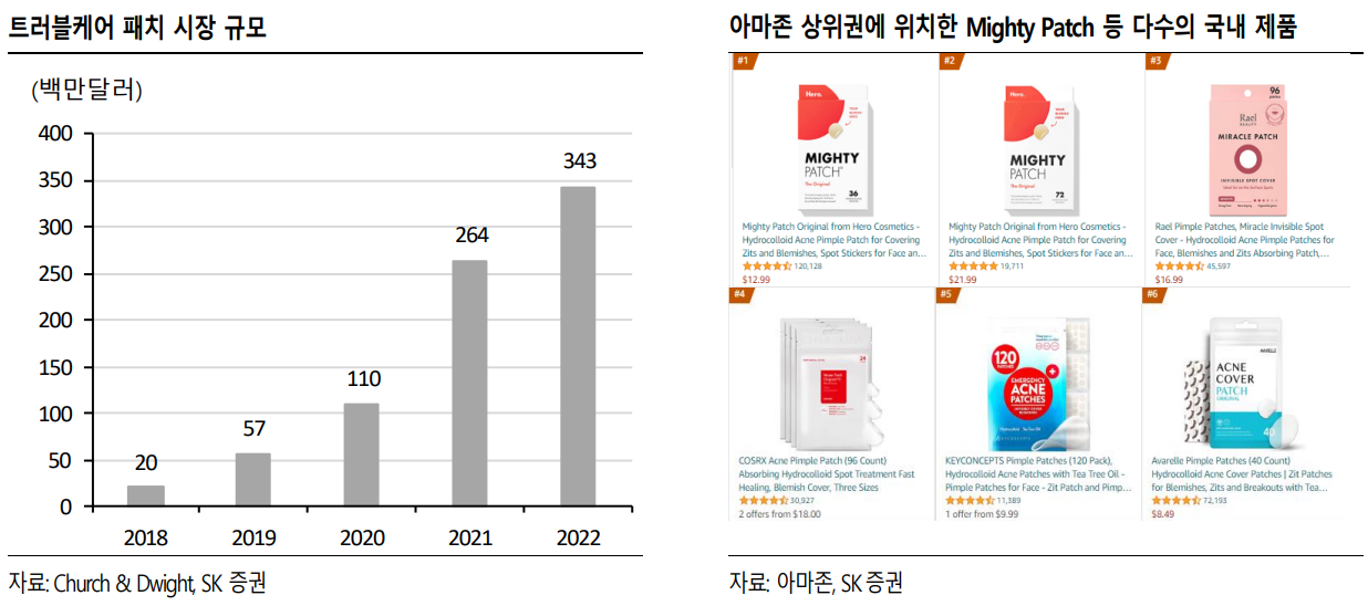 이게 원래는 위 그림 처럼 상처치료목적의 패치(patch)로 사용되어왔었는데, 미용목적으로 개발되었어요. 2007년 티앤엘이 국내 최초로 하이드로콜로이드 개발에 성공하여 이를 기반으로한 트러블케어 패치 미국시장에 진출(2018년)했어요. 구체적으로 상처치료용 패치에서 여드름, 주름, 미백 등 트러블 케어 영역으로 진출한 것이죠. 티앤엘은 미국 파트너사 Hero와 파트너쉽을 맺고 트러블케어 패치인 'Mighty Patch'를 판매하고 있습니다.