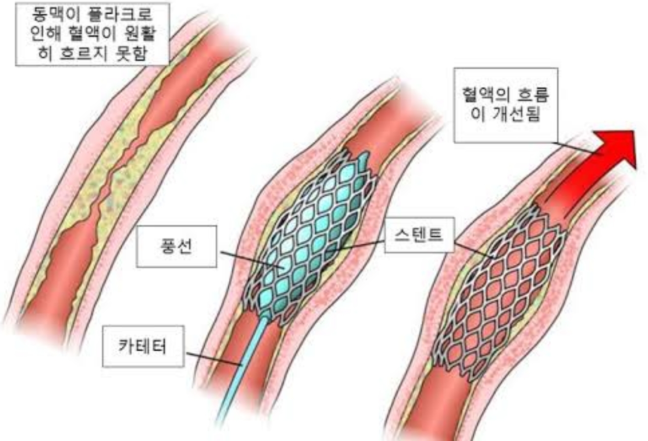위 그림을 보면, 스텐트를 넣어서 풍선처럼 부풀어 오르게 한다음 관을 넓혀주죠. 이것을 풍선형 방식이라고 하고요. 우산 처럼, 쫙 피는 방법도 있습니다. 참고로, 스텐트의 재질은 스텐레스(Stainless) 또는 합금인 나이티놀 등이 사용이 돼요.