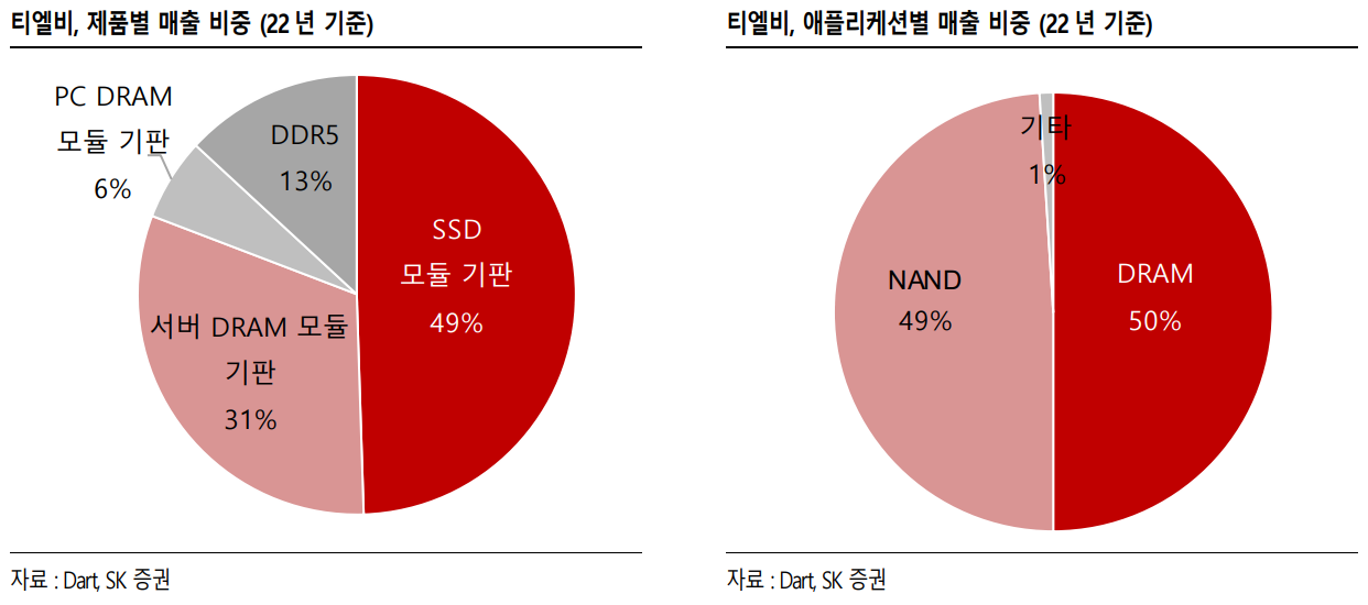 메모리반도체는 전력 On/Off와 상관없이 메모리를 저장하는 NAND, 전력이 On일 때만 저장을 하는 DRAM으로 나뉘어지죠. 주된 사용처는 PC, 노트북, 서버 등이 있습니다. 티엘비는 이러한 메모리반도체에서 칩의 명령을 외부에 전달하는 메인기판(PCB, Printed Circuit Board)을 생산 및 판매하고 있어요. 즉, 칩(Chip)이 두뇌라면, PCB는 몸인 것이죠. 동사는 DRAM전용 메모리모듈을 다루고 있는데요. 여러개의 DRAM칩을 PCB위에 탑재한 모듈을 의미합니다. 메모리가 기억을 담당하는 것이니 여러개의 메모리를 꽂으면 용량이 늘어났겠죠(ex- RAM 8GB > 16GB)