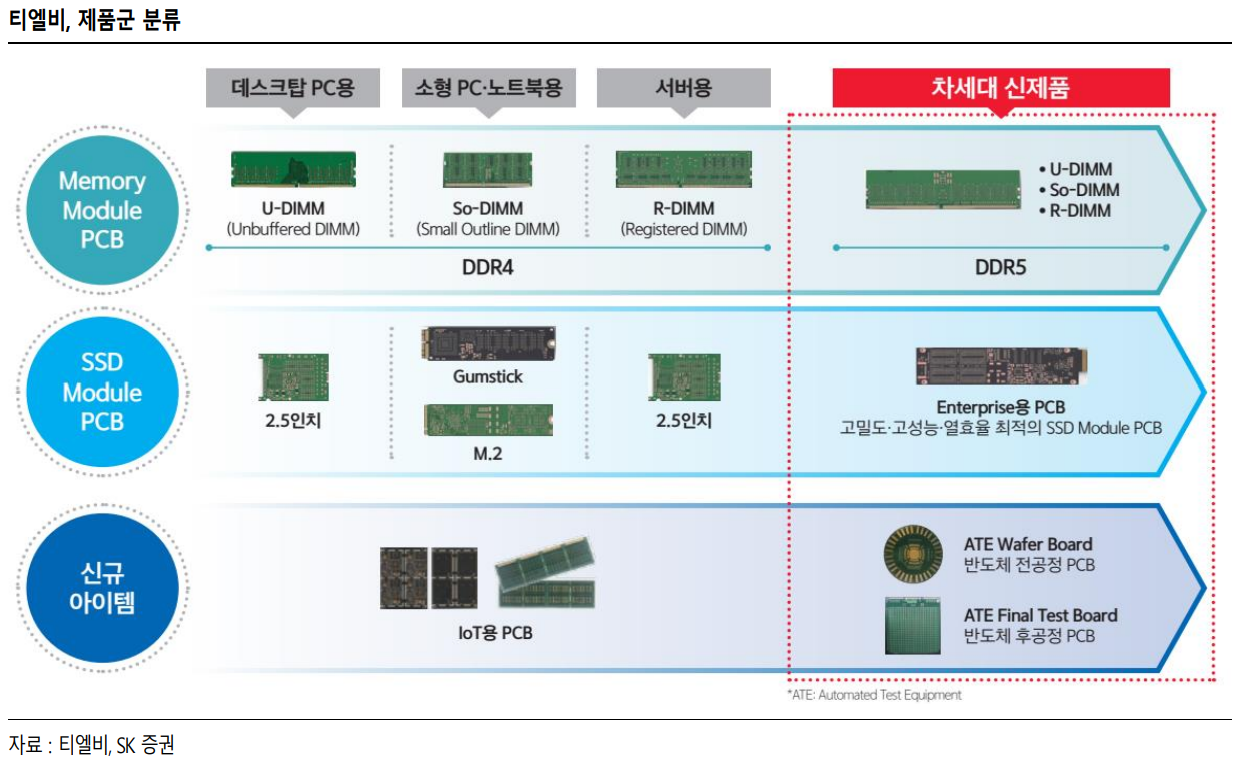 티엘비는 이러한 PCB를 모듈(Module)형태로 만들어서 판매하는데요. 대표적으로, UN-DIMM(데스크탑 PC용), So-DIMM(소형PC, 노트북용), R-DIMM(서버용)이 있어요. 특히, 차세대 신제품으로 DDR5세대 U-DIMM, So-DIMM, R-DIMM를 출시했기 때문에, DDR4세대에서 DDR5로의 교체수요가 늘어난다면 동사의 매출도 늘어날 것입니다. 참고로, DIMM은 Dual In-line Memory Module의 약자로 양면 메모리 모듈이라는 뜻이에요. DIMM은 DDR를 꽂는 메모리 소켓(Socket, 바구니)인 것이죠.