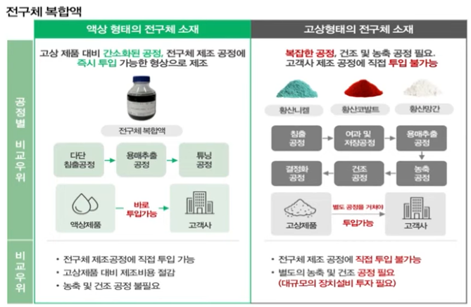 폐전지 재활용 : 전구체 복합액, 재활용 양극재 -> 액상형으로 만들어 배터리제조사가 바로 양극재 공정에 투입할 수 있게