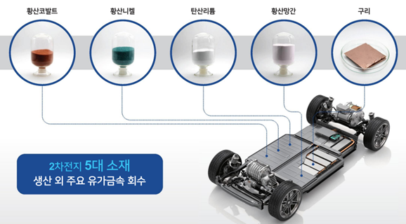 · 폐전지 재활용 : 재활용 양극재(양극재 공정 중 나온 폐양극재의 불순물제거), 전구체 복합액(재활용 양극재에 용매 섞어서 액상형-> 고객사 바로 양극재 공정 투입가능)