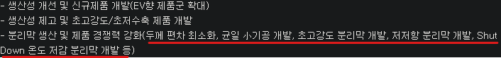 · 분리막 : 건식분리막(비용절감, 기공균일x), 습식분리막(비용상승, 기공균일o), 코팅분리막(비용상승, 기공균일o, 내열성o)