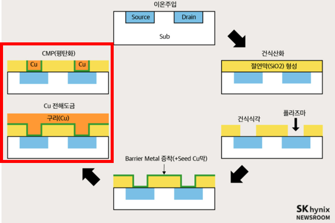 다만, 구리는 CVD/ALD 방식으로 기체화시켜서 넣지못하기 때문에 도금'액'으로 퍼붓습니다. 라면 끓이려고 냄비에 물 넣을 때 미세한 조정이 안되듯이 구리도금액도 마찬가지로 흘러 넘쳐요. 그래서, 연마작업을 해주는 것이고 이를 CMP라고 부르고 기계적장비를 CMP장비라고 부르죠.