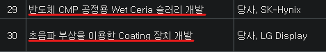 · 반도채 장비/소재 : CMP장비, CMP Slurry(Ceria Slurry, Silica Slurry), Wet Cleaning(세정장비, 웨이퍼양면 불순물제거)