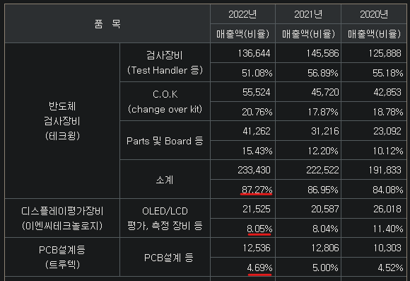 테크윙은 반도체검사장비 핸들러와 번인테스트장비를 판매하는 업체에요. 핸들러란 반도체 검사장비의 보조장비라고 생각하면 됩니다. 반도체는 복잡하고 예민하기 때문에 장비 하나만 가지고 되지않는데요. 그렇기 때문에 메인 장비를 보조해주는 핸들러는 필수품이에요. 테크윙은 이러한 핸들러를 만들고 있으며 메모리향이 주력이며 비메모리향도 점차 늘려가고 있는 추세입니다. 테크윙은 핸들러 뿐만 아니라, 반도체를 고온/저온에서 테스트하는 번인테스터(Burn-In Tester)도 만듭니다. 번인테스터는 전공정용 Wafer Test, 후공정용 Fianl Test 둘 다 적용할 수 있는데요. 다만, 동사의 번인테스터는 아직 Final Test까지만 가능합니다. Wafer Test용 번인테스터는 R&D 투자 중이고요. 반도체 검사장비 핸들러 레퍼런스를 보유한 테크윙은 디스플레이 검사장비까지 생산하고 있습니다. 디스플레이 부품들이 점차 모듈화가 진행되고 있는 추세인데요. 그래서, 모듈 외관검사장비가 디스플레이 사업부문에서는 테크윙의 주력 제품이 되고 있습니다.