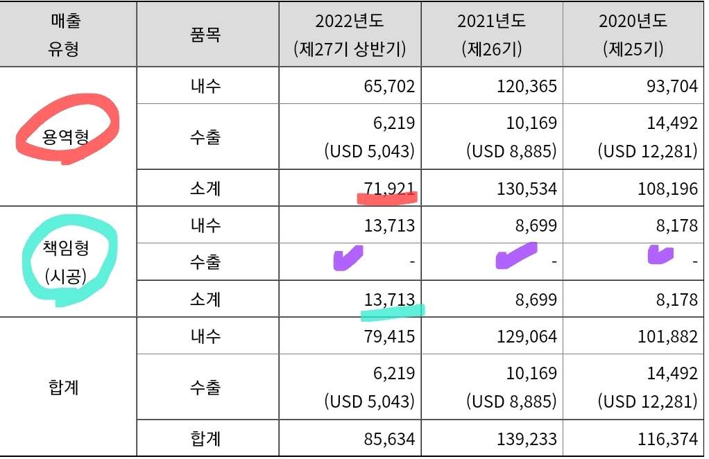 우선, 용역형, 책임형 매출을 나눠서 볼게요. 앞서, 사우디가 용역형으로 한미글로벌과 계약을 맺었다고 말씀드렸죠. 그럴만도 하는게 한미글로벌의 용역형 매출은 책임형 매출보다 무려 20년에는 13배, 21년에는 15배입니다. 22년도도 용역형과 책임형 차이가 엄청나게 좁혀질 것 같지는 않아요. 이마저도 더 따져봐야합니다. 용역형과 책임형 내외매출로 구분해볼까요. 용역형은 그래도 100억 이상의 수출을 하고 있지만 책임형은 아예 없습니다. 결국, 한미글로벌의 책임형건설사업관리도 내수에만 100% 의존하고 있는 것이죠. 물론, 용역형, 책임형 둘 중 뭐가 더 나은지를 보는 것이 아닙니다. 현재 보고자 하는 것은 사우디가 네옴시티 프로젝트를 수행하는데 한미글로벌에게 얼만 큼의 수주를 주고 책임을 주느냐인 것이죠.