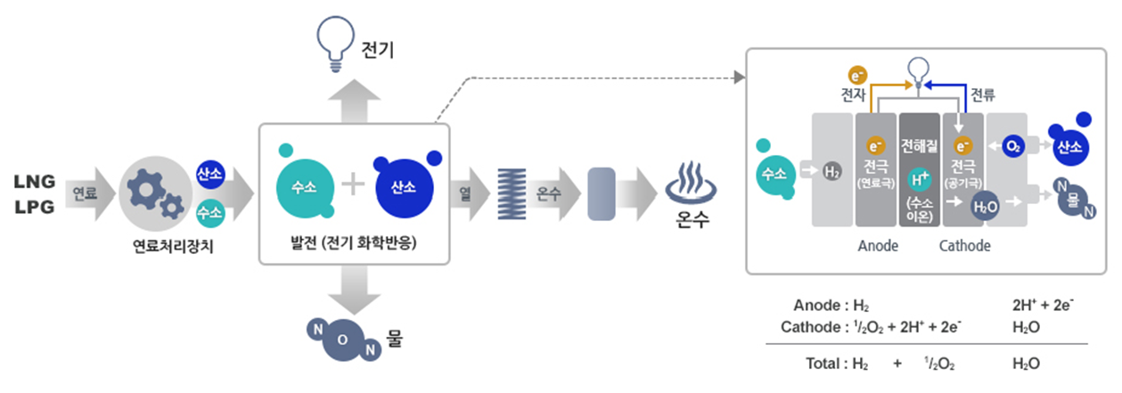 * 수소연료전지(Fuel Cell) : LPG, LNG > 개질기를 통한 수소추출 > 연료전지스택(Stack)에서 산소(O2)와 반응 > 열+전기 발생 > 열 : 지역난방 / 전기 : 전력사용
