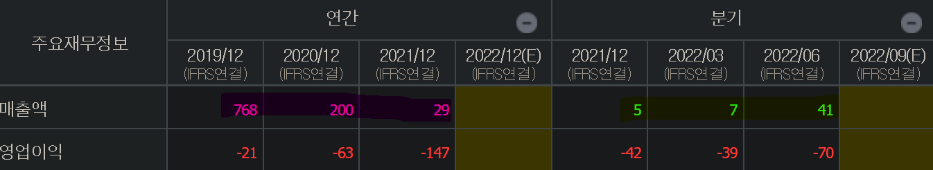 - (22.09.09) 영업이익 5년 이하 연속적자 or 매출액 30억원 미만이면 상장폐지 가능성(코스닥규정). 19~21년까지 영업이익 적자. 22년도 영업적자를 기록할 것으로 봄. 다만, 매출액은 22년 2분기 매출이 41억원(>30억)을 넘음으로써 한숨 돌림.