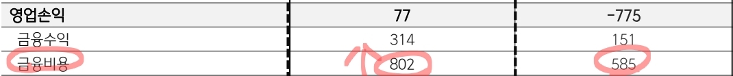 무려 이번분기에 금융비용에만 802억을 지출합니다. 영업이익의 1000%를 이자내는 비용에 지출한거에요.