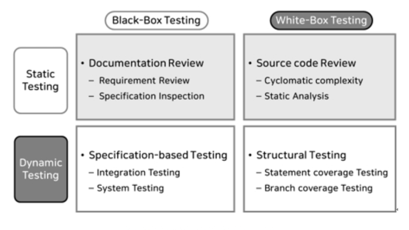 소프트웨어를 테스팅하는데 있어서 크게 두 가지로 일단 나눠야해요. 1. 소프트웨어를 키고 직접 동작을 살펴보는 것 / 2. 소프트웨어 자체 내부구조 파악이 있어요. 우선, 소프트웨어를 직접 실행하는(1번 테스팅)것은 크게 정적 테스트(Static Testing)과 동적 테스트(Dynamic Testing)으로 나눌 수 있어요. 정적 테스트는 프로그램 시작전에 소스코드를 전체 또는 일부를 테스팅하는 것이고요. 동적 테스트는 소프트웨어를 실행한 후 기대값과 결과값의 차이를 테스팅하는 것이에요.