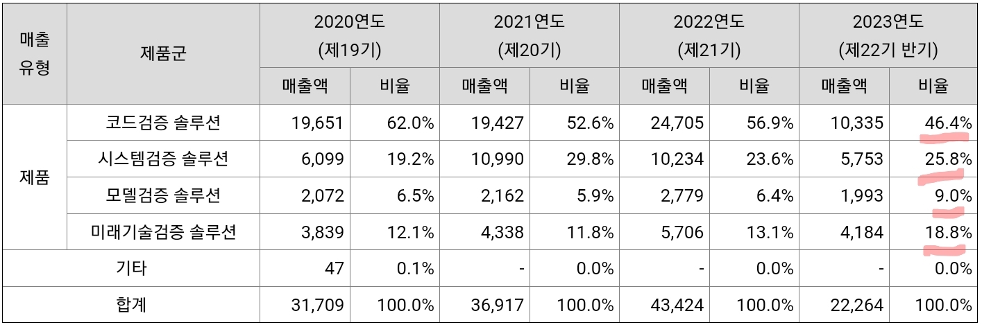 코드검증솔루션(47%, 범용코드테스팅), 시스템검증솔루션(26%, 자동차ECU=변속기,브레이크,에어백), 미래기술검증솔루션(19%, ADAS, IVI, AVN), 모델검증솔루션(9%, 롤모델 결과값을 기준으로 테스트 코드 비교) / 주요거래처 : 자동차, 원자력, 국방, 철도 > 안전에 민감한 산업군 위주 / 2대주주 : 현대차