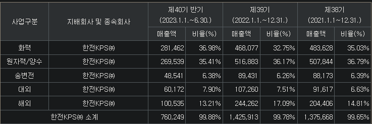 발전정비(71%), 송변전정비(6%), 해외정비(8%, 인도,필리핀,인도네시아,요르단,아프리카,미국, UAE)