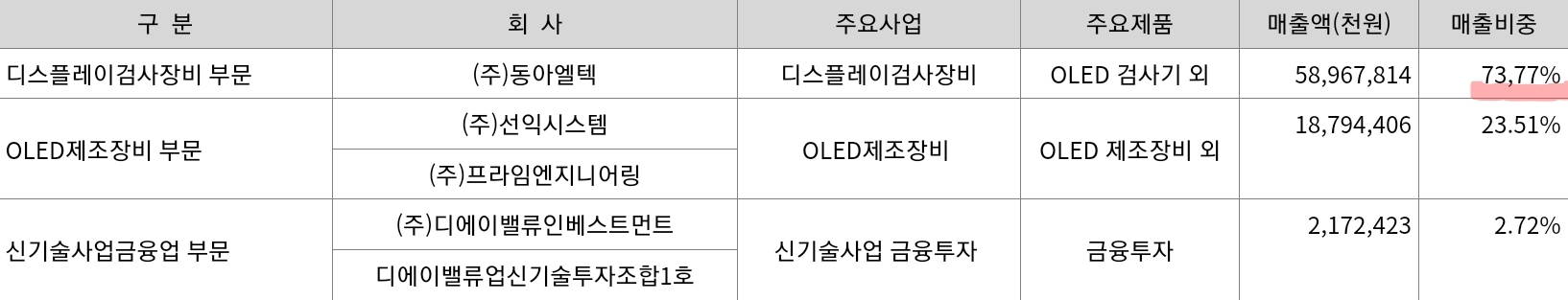OLED검사장비(74%), 선익시스템(24%, OLED증착장비), 투자(2%, 신기술사업업체에 투자)