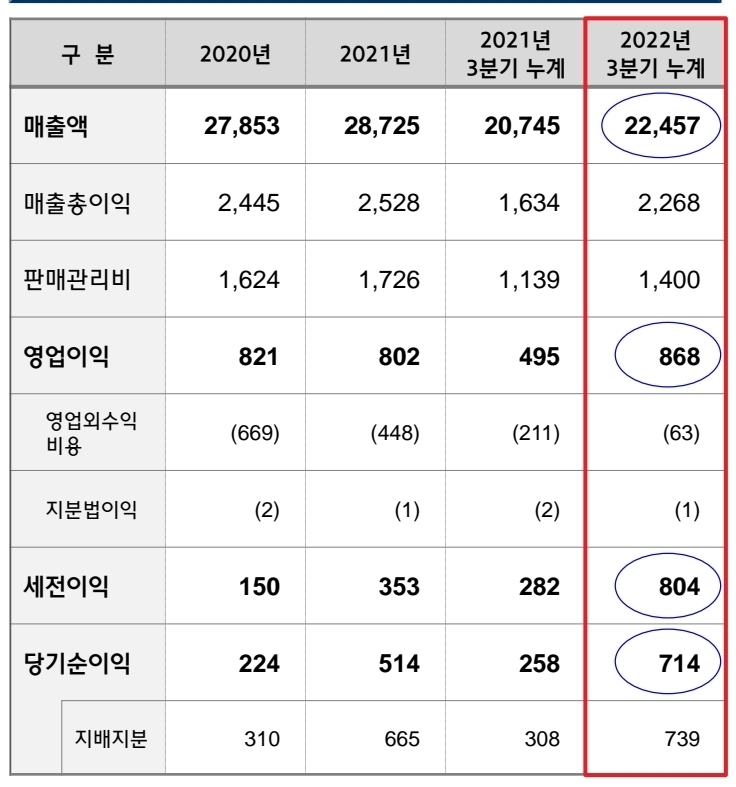 디펜스솔루션이 -4% 정도 매출액 전년 대비 감소한 것을 제외하고는 레일, 디펜스는 성장했어요. 특히, 수주금액이 엄청나게 늘었습니다. 수주금액만 늘어서는 안되죠. 100만원짜리 원가를 10만원에 해주겠다고 하면 누구나 수주를 줄테니깐요. 남는게 있어야합니다. 영업이익은 근 3년간 올해 가장 많이 868억원으로 많이 벌었구요, 법인세를 차감하더라도 714억이나 남을 정도이니 지난 20년 224억, 21년 514억과 비교해보면 올해는 현대로템의 해라고 할 수 있을 것 같아요.