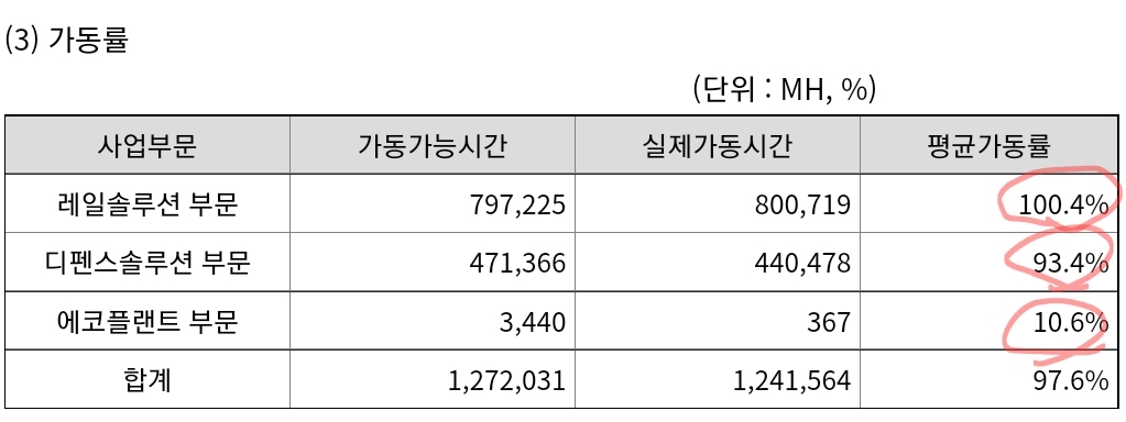 매출액 비중 가장 큰 레일솔루션은 평균가동률이 100%를 넘었어요. 가동능력을 뛰어넘어서 실제로 공장을 돌렸다는 거죠. 22년 3분기 수요가 강했던 것으로 보입니다. 반대로, 매출액 비중 가장 낮은 에코플랜트 부분은 공장가동률이 자연스레 떨어집니다. 하루 24시간 중 2.4시간 밖에 돌리지 않았다는거네요. 하루 중 점식식사와 커피 한잔 정도의 시간만 돌렸다는 얘기입닌다.
