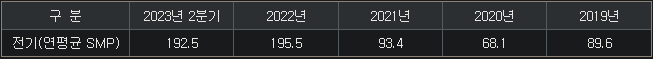 SGC에너지는 전기를 판매할 때, 한국전력이 정하는 SMP 가격에 연동하여 판매를 합니다. SMP는 System Marginal Price의 약자이며 계통한계가격을 뜻해요. 즉, 수요자인 한국전력이 이 가격에 살 테니까 팔라고 하는 것이죠. 주문자가 가격을 정한다는 것이 이상하게 들릴 수도 있는데요. 하지만, 전력발전소에서는 한국전력의 말을 잘 들어야해요. 한국전력은 국가기관이자 송배전망을 독점하고 있기 때문에 이곳에 판매하지 않으면 시장이 존재하지않습니다. 아래 표를 보면, SMP가격이 나와있는데요. 2022년부터 SMP 연평균 가격이 뛰기 시작했죠. 그 이유는 러-우크라이나 전쟁으로 인한 에너지가격 급등 때문이에요.