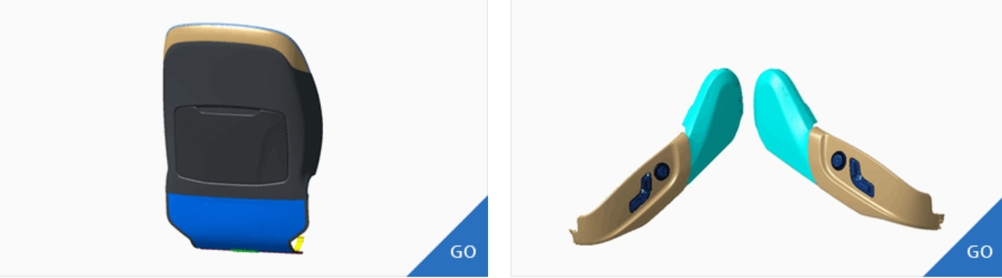 · 자동차 시트(Seat) : 시트 패드(Seat Pad), 헤드 레스트(Head Rest), 암레스트(Arm Rest), 백보드 판넬(Backboard Panel), 사이드 패드(Side Pad), 쉴드커버(Shield Cover, 의자조절기능 커버)