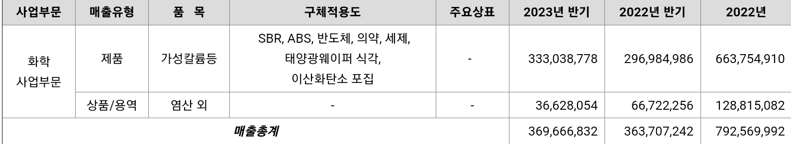 · 화학 : 가성칼륨(수산화칼륨, KOH), 탄산칼륨, 액체염소(한화솔루션 PVC 원재료 공급) / 원재료 : 염화칼륨(90%비료용, 10% 수산화칼륨용)
