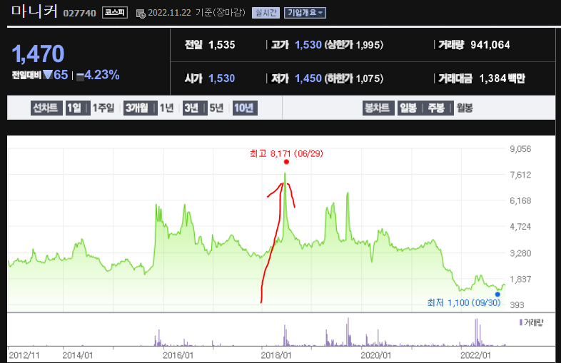 맞아요. 월드컵 때 치킨 수요가 더 늘어나는 것은 맞고 이는 교촌에게 행복한 소식도 맞아요. 지난 월드컵인 2018년 교촌에프앤비의 주가를 보고 싶었지만, 2020년 12월에 IPO를 했기 때문에 데이터는 없어요. 다만, 닭을 파는 마니커를 가져와봤는데요, 2018년 러시아월드컵이 06.14일날 했어죠. 덕분에 마니커는 6.29일 10년 이래 최고점 찍습니다. 물론, 지금은 내려왔지만요.